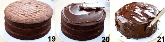 Pon encima de los 2 discos rellenos con la crema de chocolate la última tarta 19 y cubre toda la tarta con la crema restante 20 (¡sé generoso!): si quieres darle a la cobertura de la devil's cake el típico aspecto de “ondas rugosas”, usa una espátula y unta moviendo la crema 21. ¡La devil's food cake está lista para ser disfrutada! Recuerda conservar la tarta en el frigorífico.