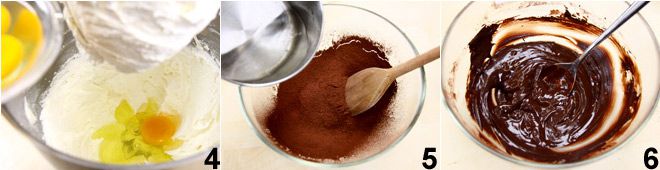 Añade a la mezcla, siempre batiendo, un huevo a la vez 4 a temperatura ambiente. En un bol pequeño pon el cacao tamizado y añade el agua hirviendo 5, para obtener una crema lisa y sin grumos 6, luego deja enfriar.