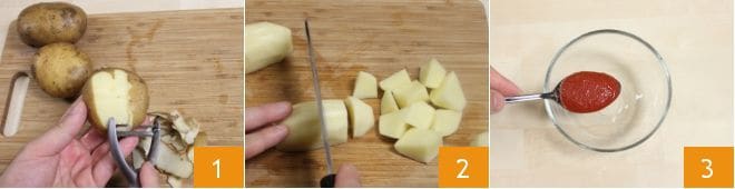Para realizar las patatas bravas lavar y pelar las patatas con un pelador o un cuchillo pequeño 1, cortarlas en pequeños trozos 2 y reservarlas. En un bol pequeño colocar el puré de tomate 3