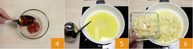 y el vinagre 4, mezclar la salsa y reservarla, servirá para condimentar las patatas. En una sartén amplia verter el aceite de oliva 5, luego añadir los trozos de patata 6