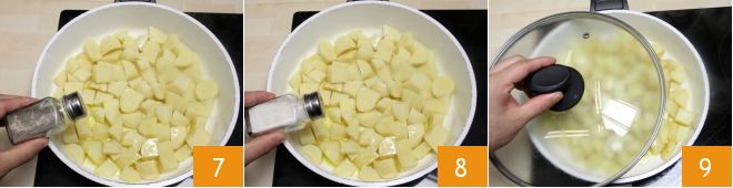 pimentar 7, salar 8 y freír las patatas durante 5 minutos. Luego cubrir con una tapa 9, bajar el fuego y cocinar por otros 20 minutos aproximadamente, verificando la cocción de vez en cuando y removiendo las patatas con una cuchara con cuidado de no deshacerlas.