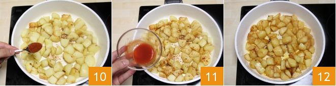 Pasado este tiempo aromatizar las patatas con el pimentón 10 y subir el fuego, añadir el puré de tomate con el vinagre de vino tinto 11 y cocinar por otros 3 minutos para que la salsa se absorba. Ahora tus patatas bravas están listas 12 para ser disfrutadas como en España: sírvelas en pequeños cuencos de barro pinchándolas con palillos, ¡desaparecerán rápidamente!