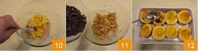 Mezcla los ingredientes 10 ayudándote con un tenedor. Luego añade también el chocolate 11 y mezcla este último con los ingredientes. Finalmente, coloca en una fuente para horno ligeramente enmantecada los melocotones uno junto al otro con el hueco hacia arriba, preferiblemente sin dejar espacios. Rellénalos con algunas cucharadas del relleno, dando al relleno la forma de una pequeña cúpula 12.