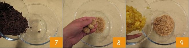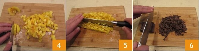Ahora dedícate al relleno: corta la pulpa extraída de los melocotones 4 y pícalo con un cuchillo 5 o alternativamente usando la batidora. Reserva. Toma el chocolate y tritúralo finamente 6.