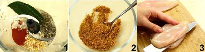 Para preparar las piadinas con pechuga de pollo y maíz, comience realizando la mezcla de especias, únalas todas en la picadora 1, enciéndala y triture todo hasta obtener un polvo homogéneo 2; tome las pechugas de pollo, córtelas a la mitad y retire los pequeños huesos internos y las posibles partes de grasa; corte las pechugas de pollo en 4-5 trozos 3