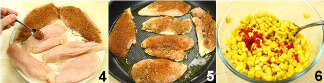 y espolvoréelos con la mezcla de especias obtenida para cubrirlos lo más posible 4. Caliente dos cucharadas de aceite en una sartén antiadherente y disponga las pechugas de pollo especiadas 5; dórelas bien por ambos lados y continúe la cocción hasta que el interior esté cocido pero aún tierno; reserve el pollo y déjelo templar.