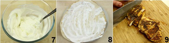 Suavice el yogur griego mezclándolo con una cuchara, hasta que esté cremoso 7. Luego caliente una sartén antiadherente a fuego medio y caliente una piadina a la vez unos instantes por cada lado, debe quedar suave para luego poder cerrarla (si desea preparar las piadinas en casa, lea la receta aquí). Unte con una espátula el yogur griego sobre la piadina 8, corte las pechugas en tiras y colóquelas en el centro de la piadina,