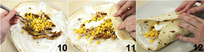 por último, añada el maíz 10; proceda a cerrar la piadina, comenzando desde abajo y doblando la pestaña de la piadina sobre el pollo 11, luego cierre el primer lado y luego el segundo sobre el primero 12. Proceda de la misma manera con las otras piadinas y disfrútelas aún tibias!