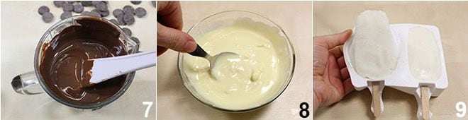 Después de este tiempo, derrite el chocolate negro y el chocolate blanco al baño maría o en microondas (7-8) y déjalo enfriar a temperatura ambiente. Saca del congelador los helados con el palo y desmóldalos 9.