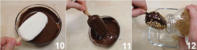 Introduce 3 helados en el chocolate negro, asegurándote de sellar bien con el chocolate el fondo, sin dejar espacios abiertos o agujeros por los que pueda salir el helado (10-11). Déjalos enfriar en el congelador sobre una hoja de papel de horno durante al menos una hora. Si quieres decorarlos con granillo de avellanas, échalo sobre el chocolate justo después de sumergirlos, de lo contrario el chocolate se endurece enseguida 12.