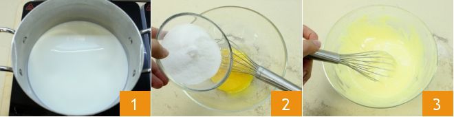 Para preparar la pinolata, comienza con la crema: en una cacerola grande, vierte la leche 1 y caliéntala a fuego lento. Mientras tanto, en un bol pequeño, vierte las yemas, añade el azúcar granulada 2 y bátelas con un batidor 3.
