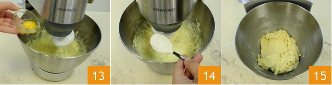 Cuando la yema se haya integrado, añade el huevo entero 13 y continúa batiendo con las varillas; luego añade la harina y la levadura, previamente tamizadas juntas, poco a poco ayudándote con una cuchara 14. Trabaja la mezcla hasta obtener una masa homogénea y suave 15.