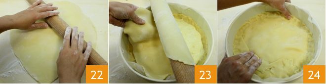 Ahora puedes extender también la otra mitad de la masa 22 para crear el disco de cobertura del mismo diámetro y grosor que el anterior. Con la ayuda del rodillo, colócala delicadamente sobre la crema 23 y haz que los bordes se adhieran a la base 24 para cerrar el pastel.