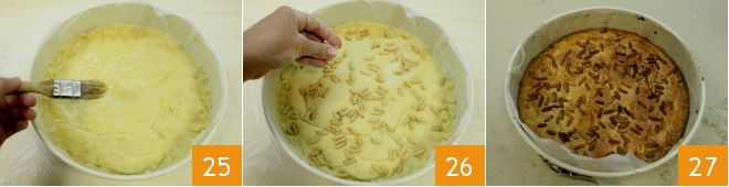 En un bol pequeño, bate el huevo con la leche fresca, luego unta la superficie del pastel ayudándote con un pincel 25. Después vierte a lluvia los piñones 26 para decorar la superficie. Luego cocina la pinolata en horno estático precalentado a 180° durante unos 40 minutos (si el horno es de convección, cocina a 160° durante 30-35 minutos). Cuando el pastel esté ligeramente dorado en la superficie, sácalo del horno 27 y deja que se enfríe a temperatura ambiente. Luego desmolda la pinolata y si quieres puedes espolvorearla con azúcar glas antes de servirla.
