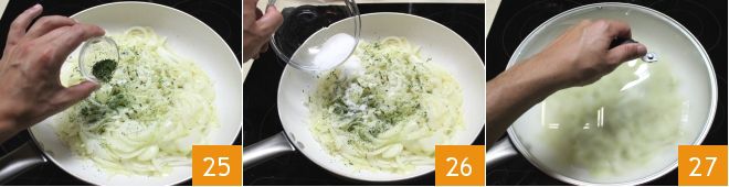 Condimentad las cebollas con la mezcla de tomillo y laurel 25 y el azúcar 26, pimentad al gusto. Cubrid con una tapa 27 y dejad cocer a fuego lento durante unos 30 minutos, hasta que las cebollas logren una coloración transparente. Las cebollas no deben dorarse, así que, si es necesario, rociad con unas cucharadas de agua caliente.