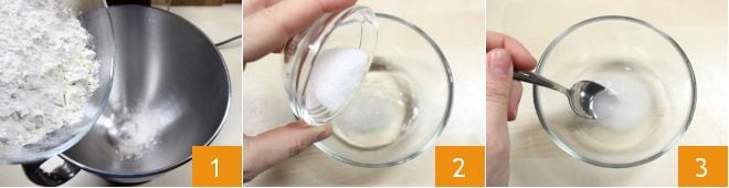 Para preparar la pissaladière, empezad haciendo la masa de pan para la base. Algunas variantes de esta receta prevén el uso de masa de hojaldre o masa brisa, si no tenéis tiempo para el levado, podéis intentar con una de estas alternativas. Tamizad la harina en el bol de una batidora de pie o en un recipiente grande si vais a amasar a mano 1. Luego, verted un poco de agua, tomada del total, en un bol pequeño y disolved la sal (2-3).