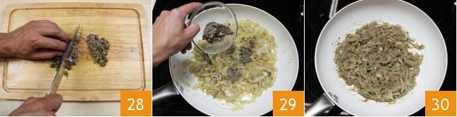 Cuando la cocción de las cebollas esté a buen punto, poned las alcaparras, ya escurridas y exprimidas, sobre una tabla junto con unos 50 g de las anchoas en salmuera que habéis desalado y limpiado. Picad 28 y, después de apagar el fuego, añadid el picado a las cebollas 29. Mezclad, integrando bien el compuesto y dejad enfriar en la sartén 30.