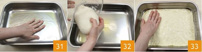 Mientras el condimento de la pissaladière se enfría, engrasad una charola de horno de 35x25 cm con las manos o con un pincel 31. Tomad la masa, que mientras tanto habrá subido, y transferidla a la charola engrasada 32, luego presionadla con las yemas de los dedos desde el centro hacia los lados, hasta cubrir toda la superficie 33.