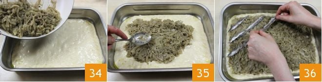 Ahora verted el condimento sobre la masa que habéis extendido 34 y esparcidlo uniformemente con el dorso de una cuchara 35, recordando dejar 2 cm de borde. Empezad a decorar la pissaladière con los filetes de anchoa restantes: cread rombos, empezando a colocar las anchoas en oblicuo 36.