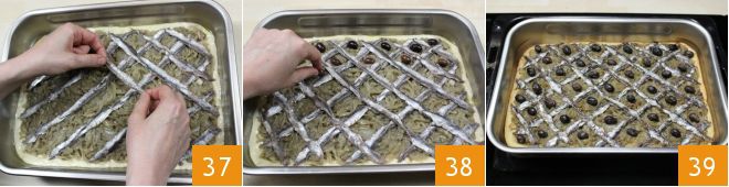 Continuad formando los rombos comenzando desde el ángulo opuesto a donde habéis empezado, completando la cuadrícula 37. Colocad las aceitunas negras en los espacios entre una tira y otra 38 y hornead en horno estático precalentado, sobre una bandeja ya caliente, a 220° durante unos 25 minutos. Cuando los bordes estén bien dorados y crujientes 39, la pissaladière estará lista para servirse como aperitivo, tal vez acompañada de un buen vino blanco fresco.