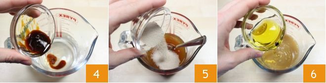 Luego, en el agua restante, disolved la malta (o el azúcar) 4, la levadura de cerveza deshidratada 5 (o alternativamente 8 g de la fresca) y agregad el aceite de oliva virgen extra 6.