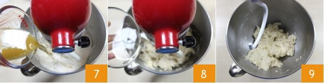Agregad la solución de agua, malta, levadura y aceite a la harina 7 y empezad a amasar a velocidad media usando la pala en la batidora de pie o con las manos para recoger los ingredientes. Después de 1 minuto, añadid también el agua con sal y continuad amasando 8. Cuando todos los ingredientes estén recogidos alrededor de la pala, sustituidla por el gancho 9 y continuad amasando a velocidad media-baja durante al menos 5 minutos, hasta que la mezcla esté suave y homogénea.