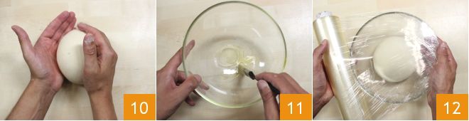 Trabajad la masa con las manos, dándole una forma esférica 10, verted un poco de aceite en un bol y pintadlo con un pincel 11. Luego colocad la masa, cubridla con film 12 y dejadla subir durante al menos 2 horas a temperatura ambiente (a unos 28-30°), hasta que su volumen se duplique.