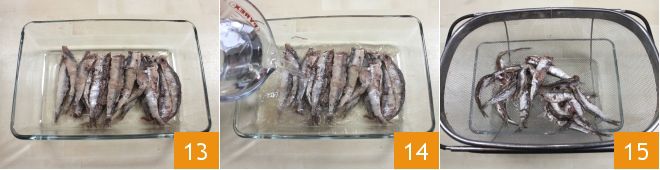 Ahora dedicaos a desalar las anchoas en salmuera, que están sin cabeza: poned las anchoas en un bol 13 y enjuagadlas repetidamente bajo agua fría para eliminar la sal 14. Escurridlas con un colador 15 y dejadlas en remojo en agua fría durante 2-3 horas, cambiando el agua con frecuencia. Realizad esta operación con mucho cuidado para evitar que las anchoas se deshagan.