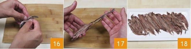 Cuando las anchoas estén más suaves, abridlas por la mitad 16 y extraed las vísceras con la espina central 17. Luego forrad una bandeja pequeña o una charola con papel absorbente y disponed los filetes abiertos 18. Al final obtendréis aproximadamente 150 g de anchoas desaladas.