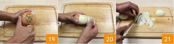 En este punto preparad el condimento de la pissaladière: limpiad las cebollas, eliminando el pedúnculo 19 y quitad la capa exterior con la piel 20. Luego divididlas por la mitad y cortadlas en rodajas finas 21.