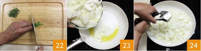 Poned las hojas de tomillo y laurel sobre una tabla de cortar, picad finamente 22 y reservad. Luego calentad el aceite en una sartén antiadherente y, una vez caliente, agregad las cebollas cortadas 23. Añadid también 2 dientes de ajo machacados con el utensilio adecuado o con los dientes de un tenedor 24.