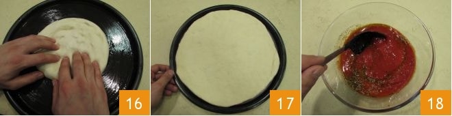 y comenzad a aplastar desde el centro hacia el exterior, tirando ligeramente de los lados si es necesario 16. Si la masa resulta demasiado elástica y tiende a volver a la forma que tenía antes, dejad a un lado la pizza que estéis estirando y proceded a estirar otra, dejando así reposar la anterior. Intentad estirar la masa por toda la superficie del molde 17. Aparte, en un bol grande, verted la salsa de tomate y aderezadla con sal, aceite y orégano 18.