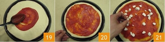 Verted un cucharón abundante de salsa de tomate sobre la base de la pizza 19 y esparcidla con un movimiento circular, cubriendo casi toda el área, dejando solo un borde de aproximadamente 1,5 cm 20. Picad groseramente la mozzarella y colocadla sobre la pizza 21.