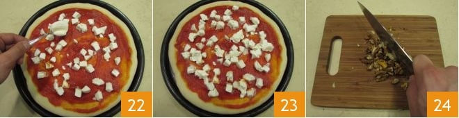 Añadid ahora el mascarpone ayudándoos con una cucharilla 22. Dejad reposar la pizza decorada durante unos diez minutos 23 y hornead a 250°C durante 12/15 minutos en horno estático (de lo contrario, bastarán unos diez minutos a 230°C en horno ventilado). Mientras tanto, picad ligeramente las nueces con un cuchillo 24.
