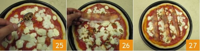 Una vez sacada del horno la pizza, añadid las nueces recién picadas 25 y las lonchas de speck 26. ¡Servid la pizza con mascarpone, speck y nueces bien caliente! 27