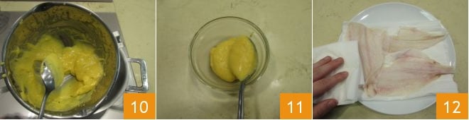 Continuando con la mezcla, veréis que poco a poco vuestra salsa empezará a cambiar de color 10 volviéndose más clara, así como cambiará su consistencia, volviéndose más densa. Cocinad durante unos 5 minutos a fuego lento, siempre mezclando, y cuando esté lista, ponedla a un lado en un tazón pequeño 11. Ahora dedicaos a la preparación de la platija: secad los filetes de platija con papel de cocina 12