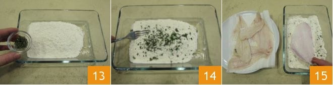 poned la harina en una fuente, añadid el tomillo desmenuzado 13, y mezclad con un tenedor de manera que se distribuya de manera uniforme 14. Entonces enharinad bien los filetes de platija por ambos lados 15.