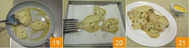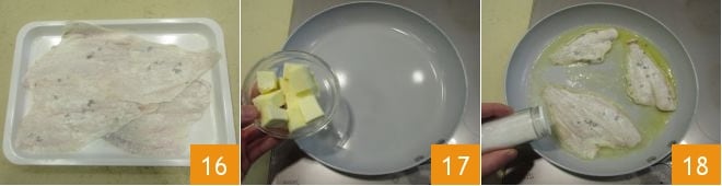 Una vez enharinados todos los filetes 16, calentad la mantequilla en una sartén antiadherente 17, luego colocad delicadamente los filetes 18, y ajustad de sal.