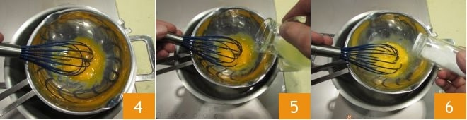 Mientras tanto, preparad la salsa: es muy importante que la cocción sea al baño maría, así que recordad que el agua no debe tocar el cazo y nunca debe llegar a hervir. Verted las yemas en el cazo y rompedlas con un batidor 4, mezclad y añadid el zumo de limón 5, la sal 6,