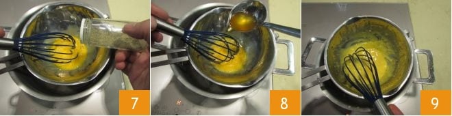la pimienta blanca 7 y luego agregad la mantequilla clarificada en hilo 8, y continuad batiendo con el batidor 9.