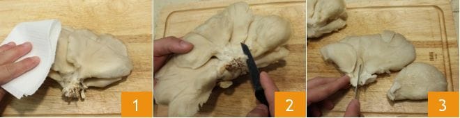 Para realizar los pleurotus a la parrilla comienza con la limpieza de las setas: con un paño de cocina limpia la superficie de los sombreros y el tallo para eliminar la tierra 1, luego con un cuchillito separa los tallos del racimo (2-3) y si es necesario pasa el paño por los sombreros y las láminas internas para eliminar posibles restos de tierra. Reserva los sombreros enteros para la cocción.