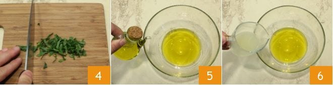 Ahora prepara la emulsión para sazonar los pleurotus a la parrilla: pica finamente las hojas de menta 4, luego vierte en un bol el aceite de oliva 5, el jugo de limón 6,