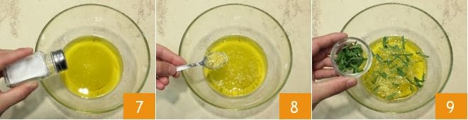 una pizca de sal 7, una cucharadita de vinagre de manzana y una cucharadita de ralladura de limón 8, añade por último las hojas de menta picadas 9.