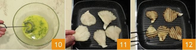 Mezcla con una batidora para amalgamar la emulsión y reserva 10. Dedícate ahora a la cocción a la parrilla de las setas pleurotus: coloca en el fuego una parrilla de hierro fundido y caliéntala, cuando esté bien caliente distribuye en la plancha las setas 11, hazlas cocinar unos minutos por cada lado 12 hasta que estén bien cocidas.