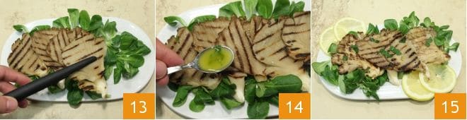 Al finalizar la cocción retira del fuego las setas ayudándote con unas pinzas de cocina y colócalas en un plato de presentación 13. Sazona los pleurotus con la emulsión de aceite y limón previamente preparada 14 y sirve inmediatamente en la mesa tus pleurotus a la parrilla bien calientes adornando el plato al gusto con canónigos y rodajas de limón 15.