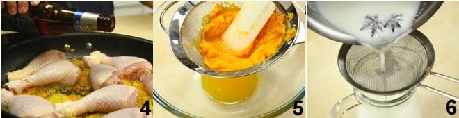 Prepara entonces el pastel de zanahorias: pela las zanahorias y cocínalas al vapor, luego tritúralas y tamízalas para eliminar el exceso de líquido 5. En un cazo lleva a ebullición la leche con el anís estrellado y en otro cazo derrite la mantequilla y añade la harina. A esta mezcla incorpora la leche que has filtrado 6, mezclando continuamente con un batidor: así obtendrás una bechamel bastante densa que salarásBechamel.