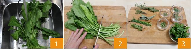 Para preparar el pollo al verde, empieza limpiando las acelgas: lávalas bajo agua corriente 1 y colócalas sobre una tabla de cortar, luego elimina los tallos 2. Después, deshoja todas las hierbas aromáticas y transfiérelas a algunos recipientes pequeños 3.