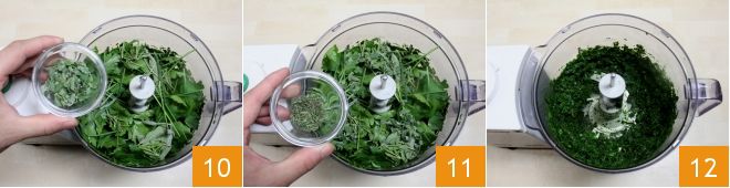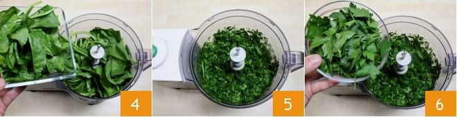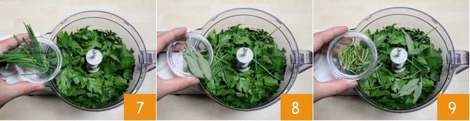 Coloca las acelgas limpias en una batidora 4 y mezcla hasta picarlas finamente 5. Ahora añade las diversas hierbas aromáticas, comenzando por el perejil 6.