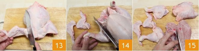 En este punto continúa con la limpieza y el corte del pollo: coloca el pollo entero sobre una tabla de cortar y comienza cortando las alas 13, procede separando los muslos 14 y finalmente divide y deshuésa la pechuga, asegurándote de haber eliminado el hueso en forma de Y y los demás trozos de cartílago 15. También puedes utilizar el pollo ya cortado y deshuesado que encuentras en el supermercado.