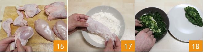 Pela las distintas piezas de pollo que has cortado 16 y luego enharínalas 17. Una vez enharinadas, toma la mezcla de acelgas y hierbas aromáticas que habías reservado y pasa las piezas de pollo hasta empanarlas por ambos lados 18.